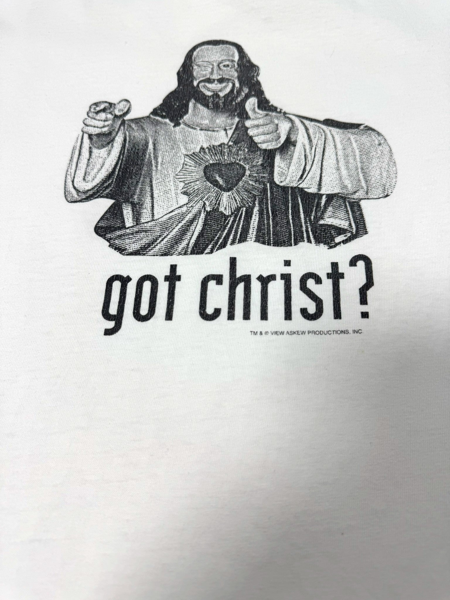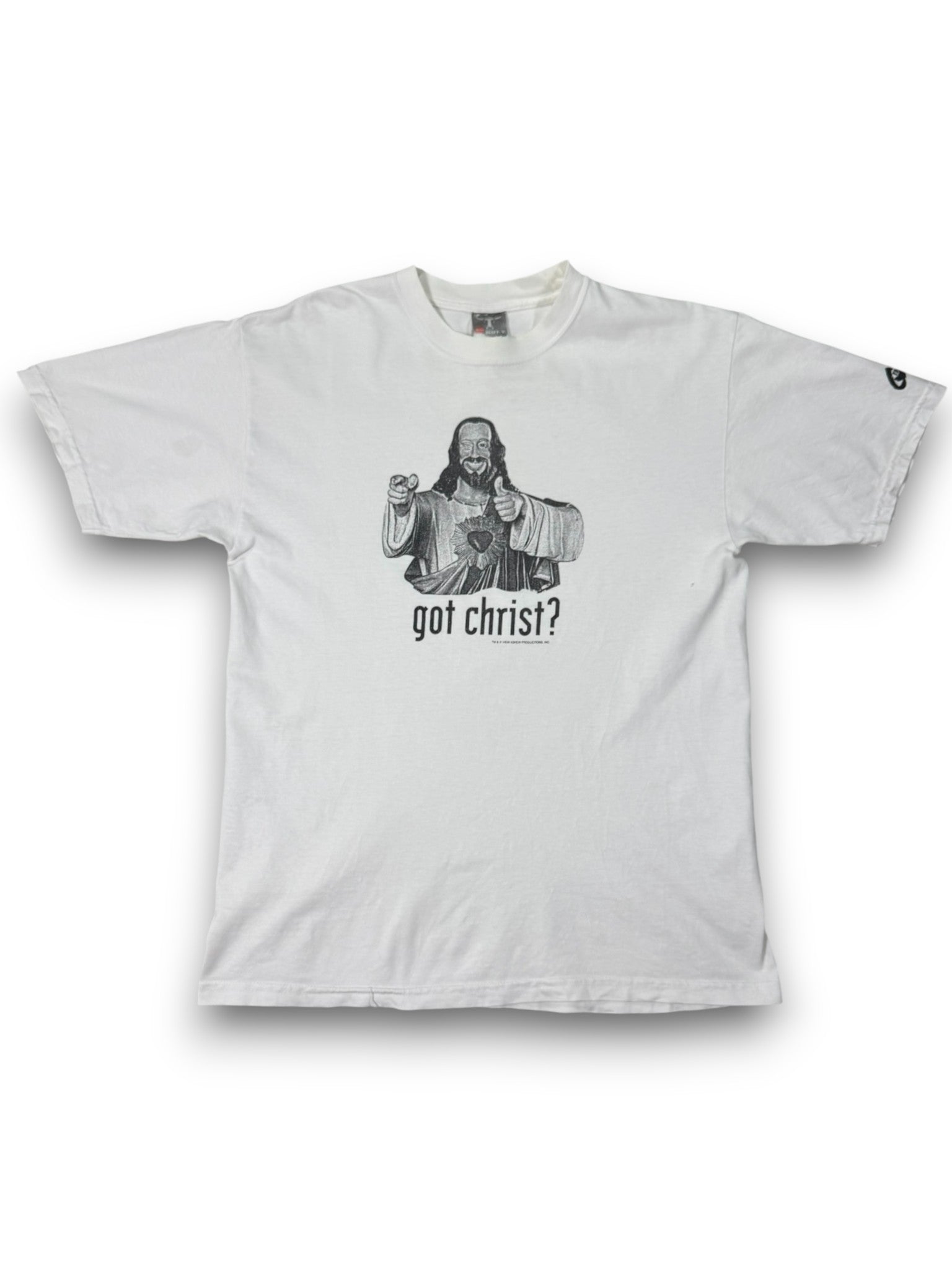 Vintage Christian graphic tee featuring a bold “got christ?” front print with a black-and-white depiction of Jesus giving a thumbs up.