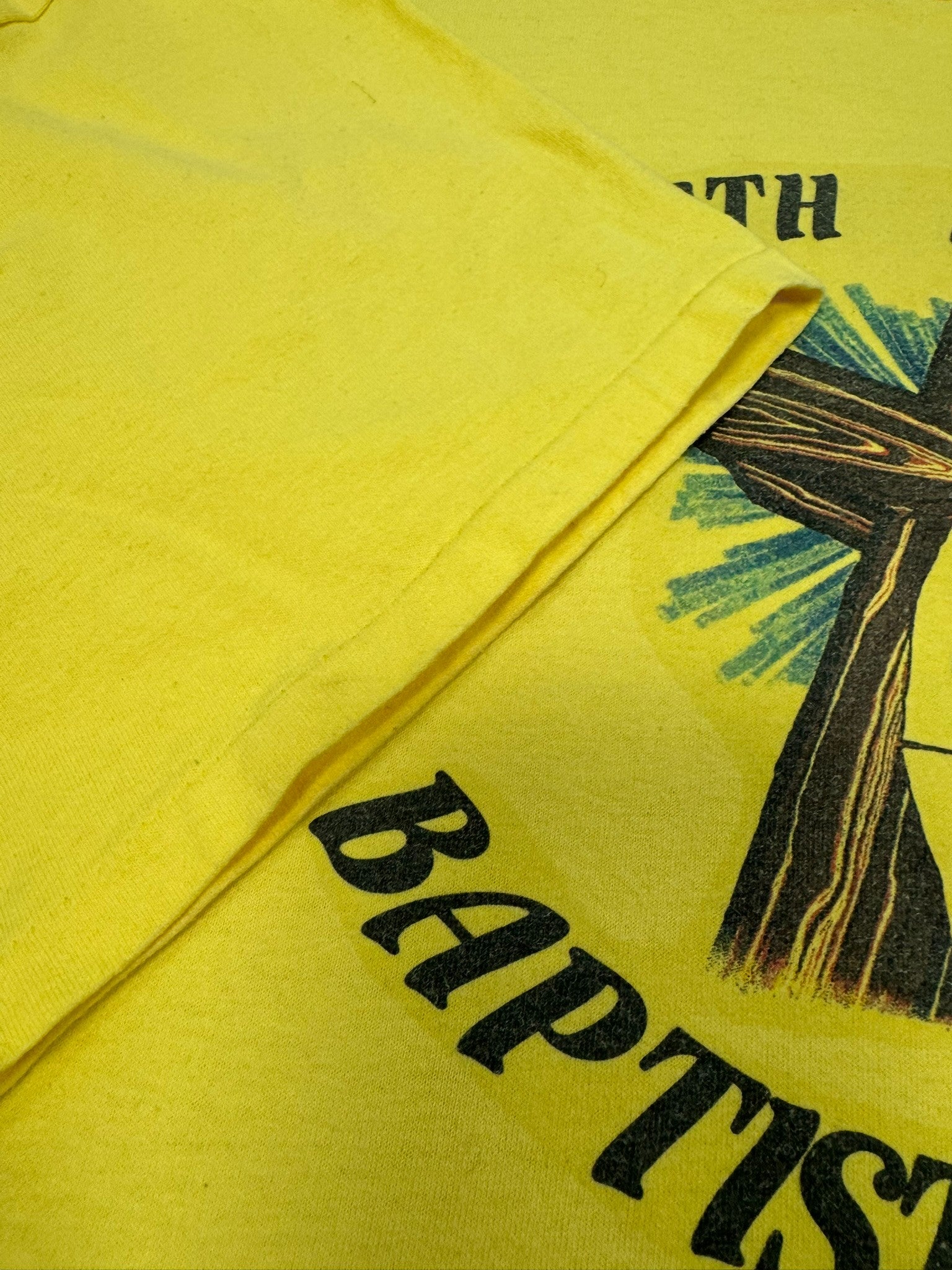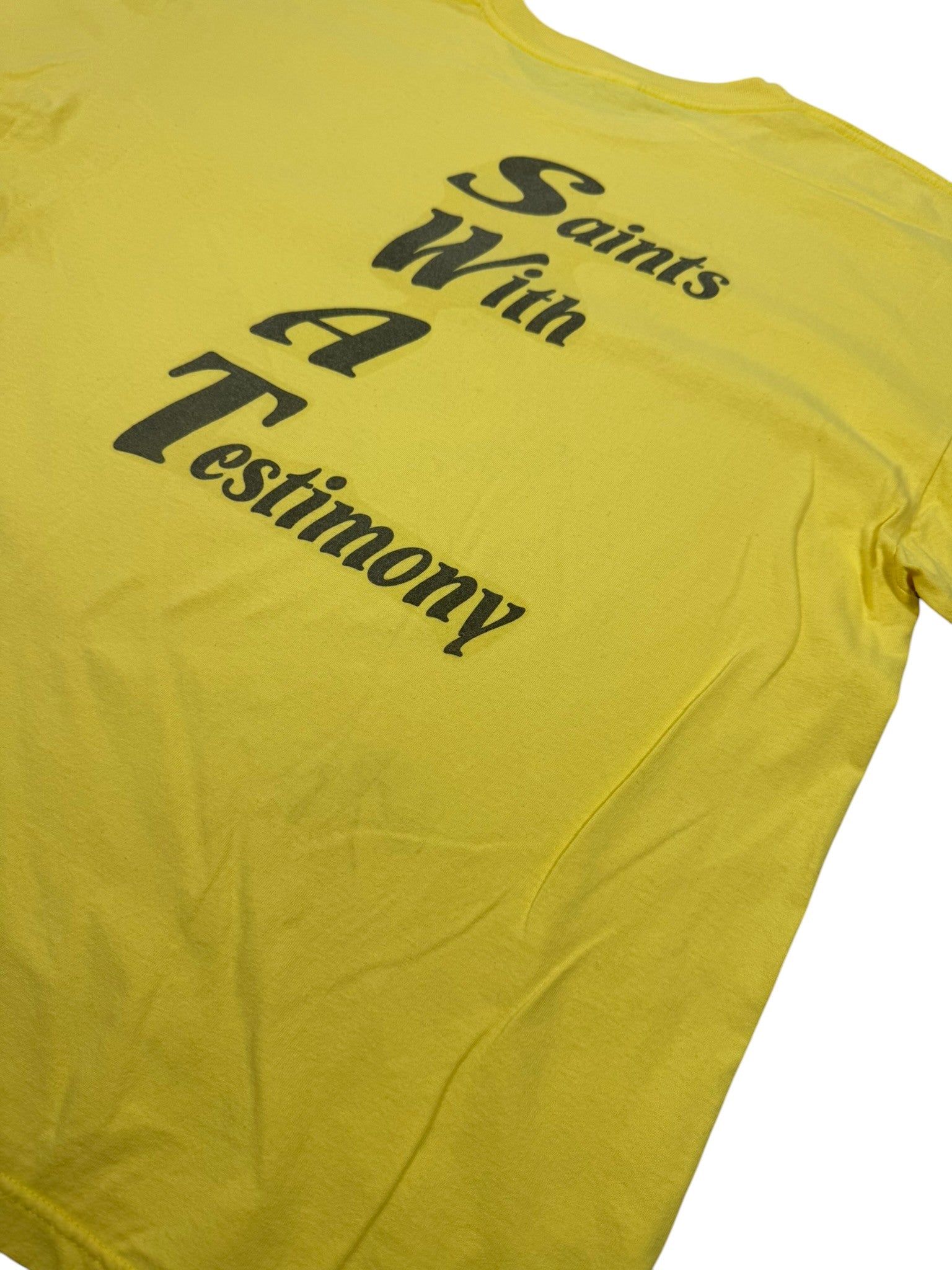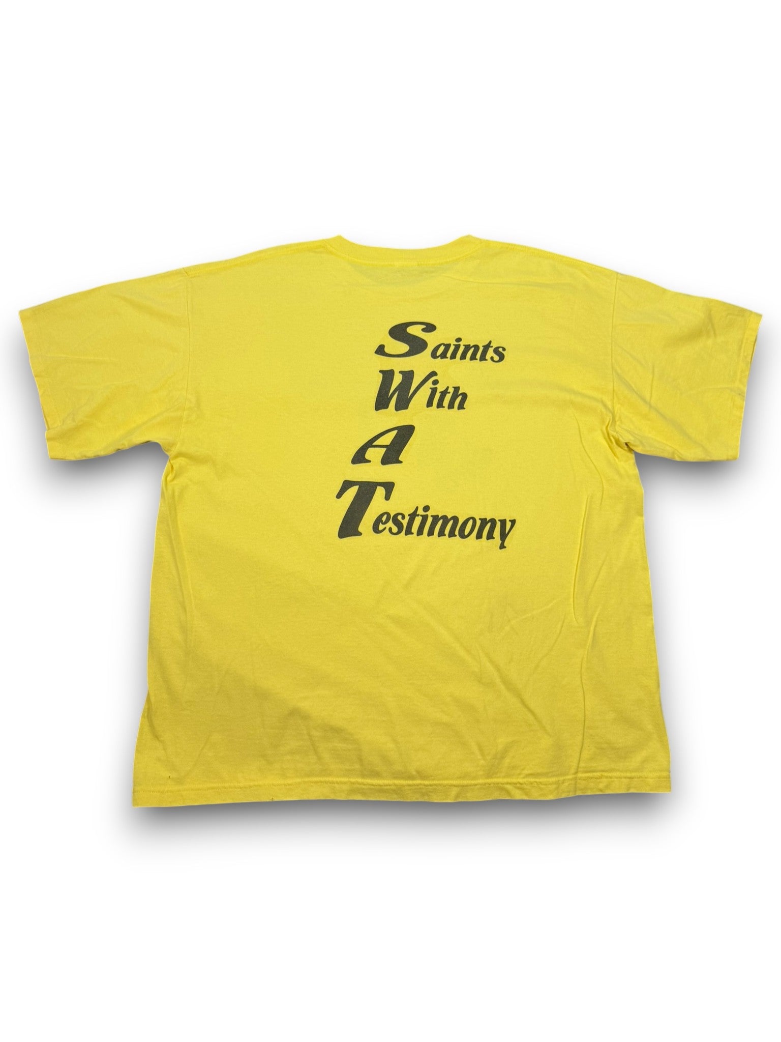 The bright yellow colorway pairs with classic church artwork on the front and SWAT “Saints With A Testimony” printed on the back, making this a RARE standout vintage religious tee. Printed on a Murina pre-shrunk cotton blank and made in the USA.