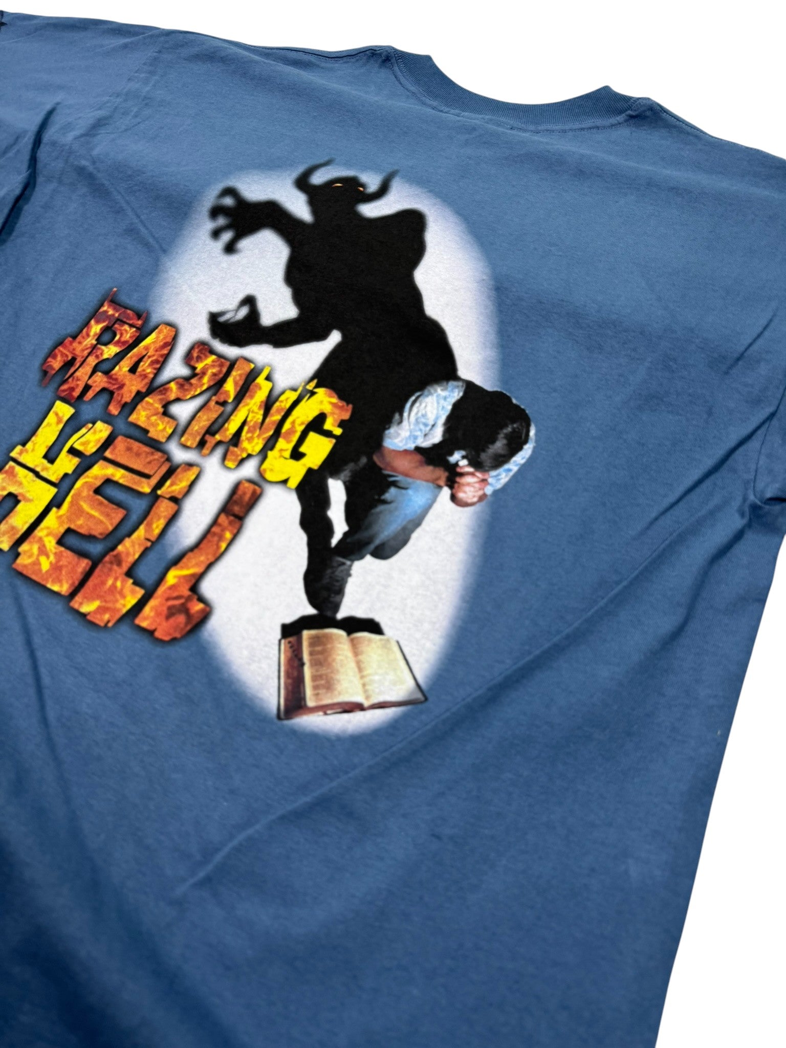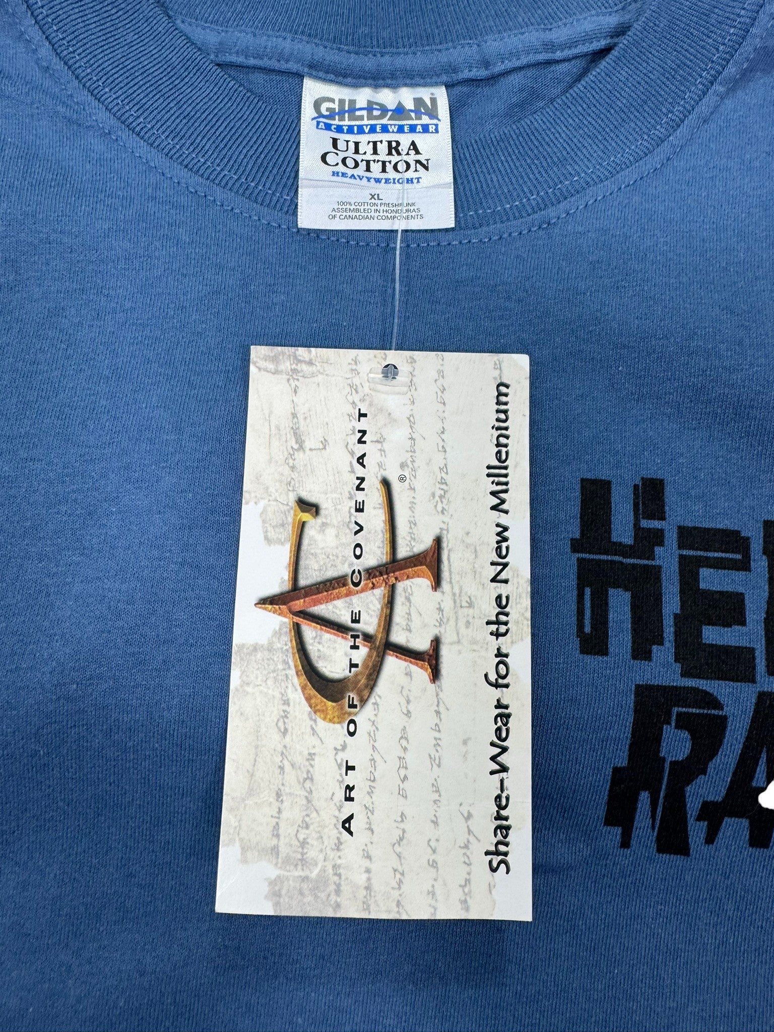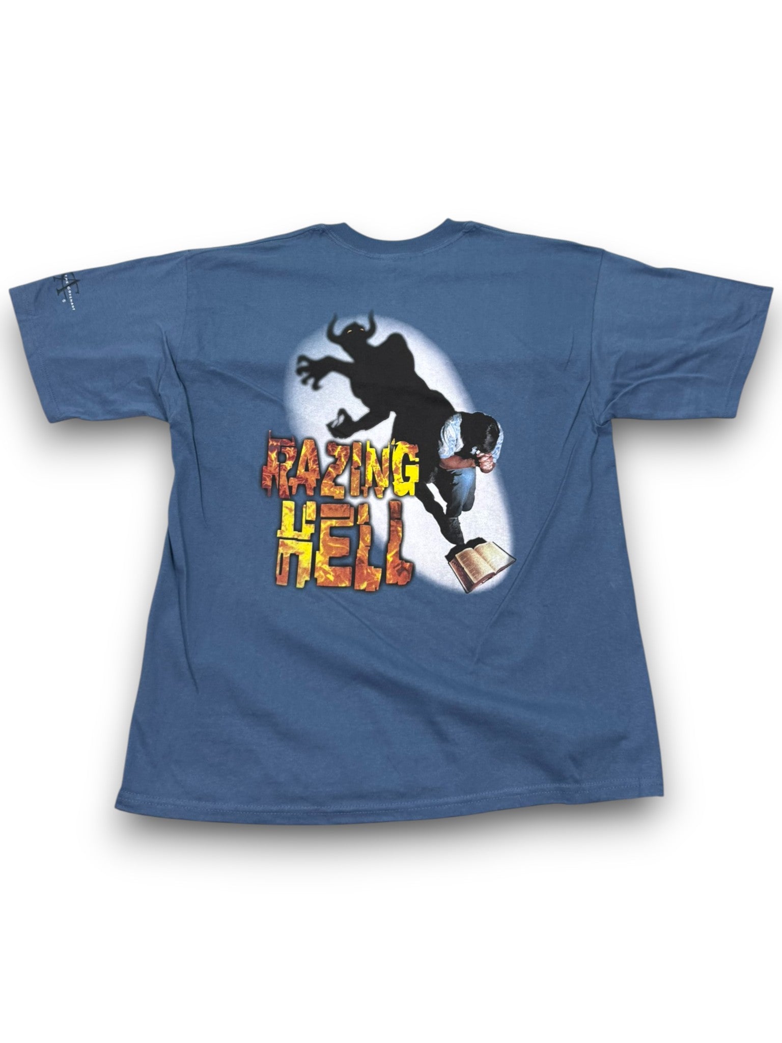 Vintage Art of the Covenant “Razing Hell” Christian graphic t-shirt featuring a bold back hit with dramatic imagery and typography, paired with a minimal front chest print reading “Hell Razer.” Printed on a Gildan Ultra Cotton heavyweight blank in a faded blue tone, this piece is new with original tags attached and delivers classic early-2000s faith-based streetwear style.