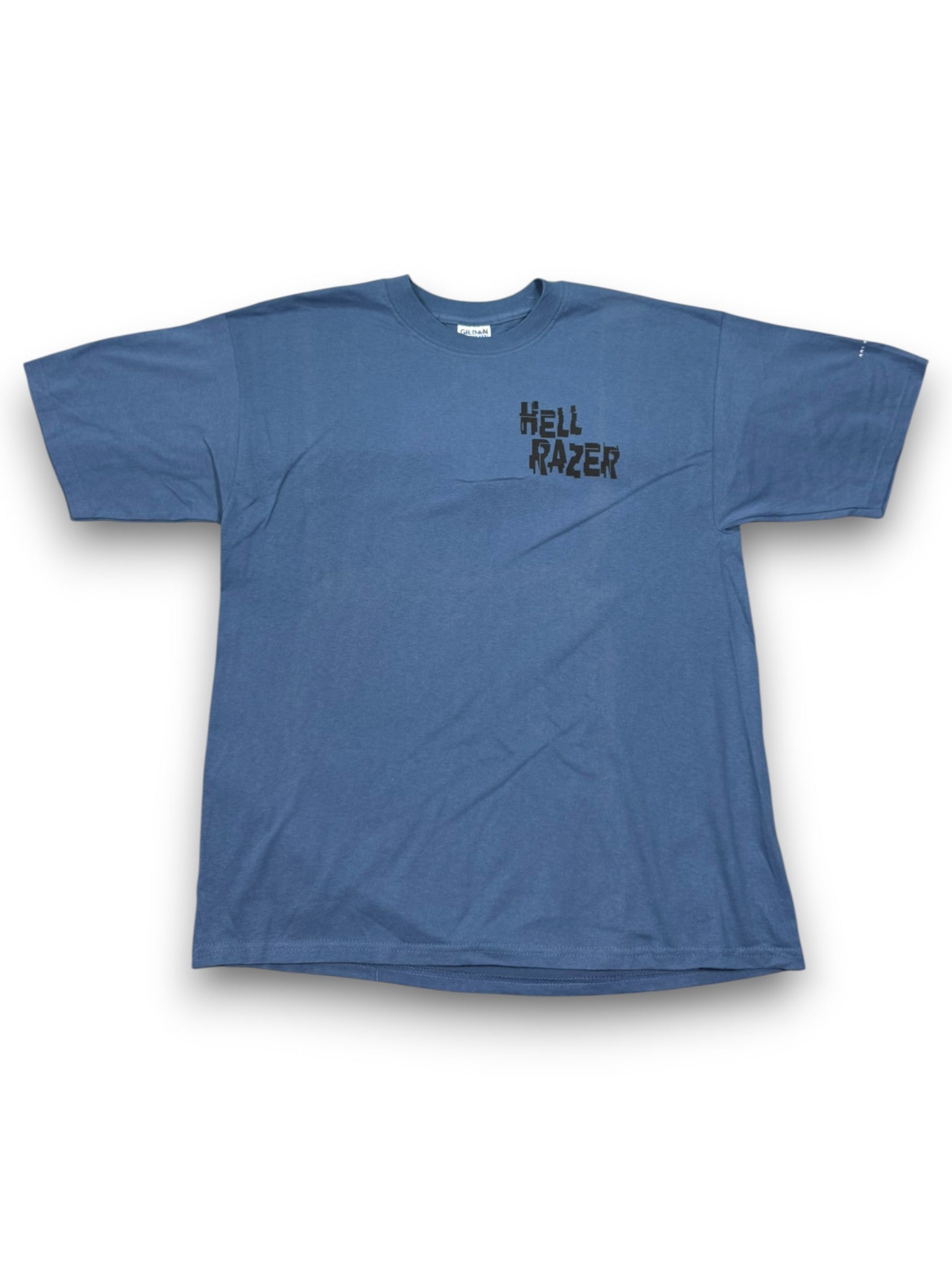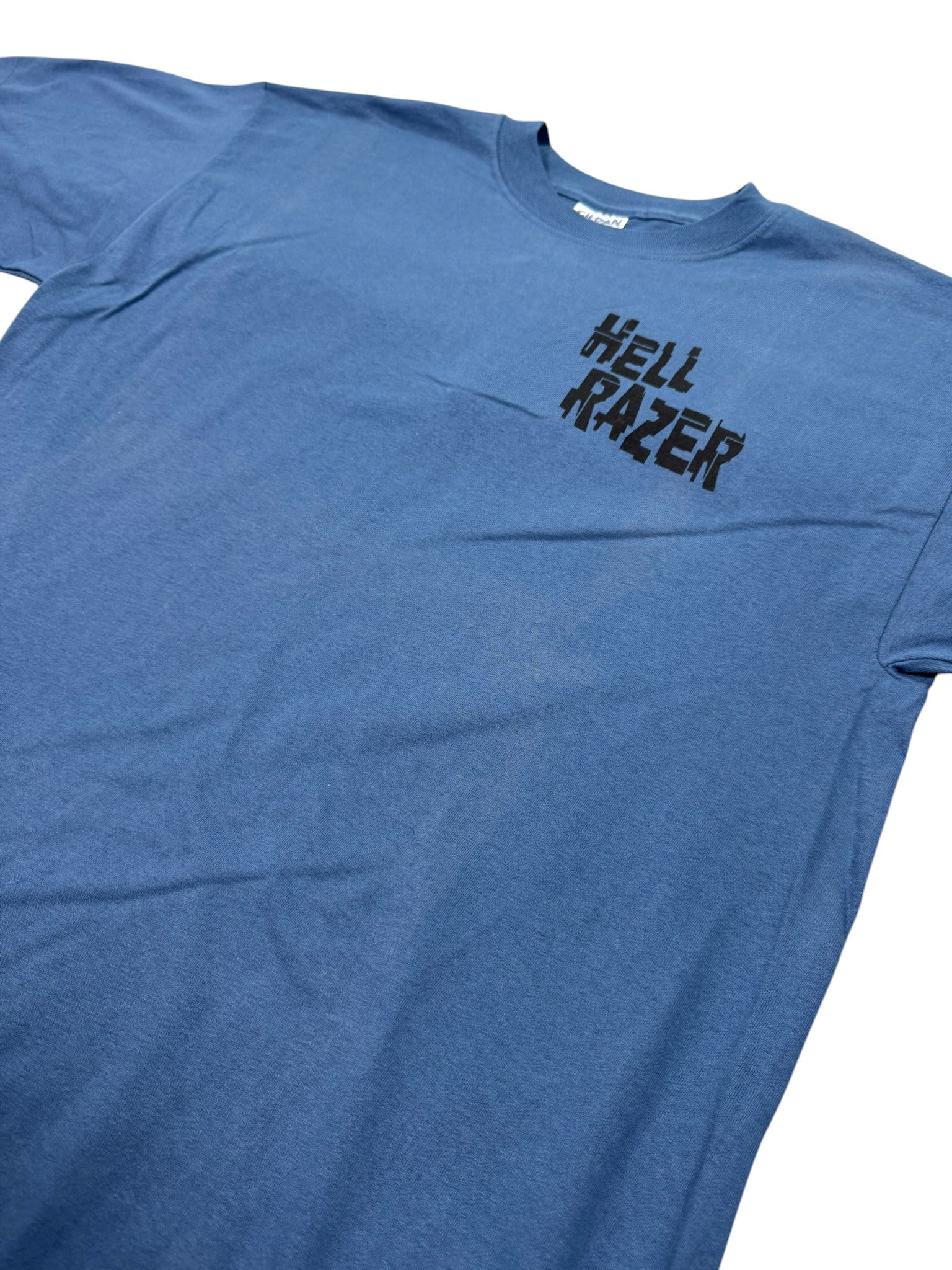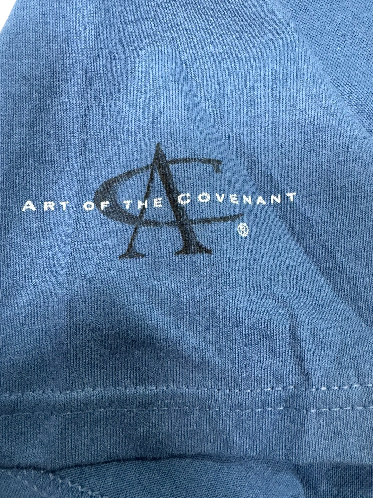 Vintage Art of the Covenant “Razing Hell” Christian graphic t-shirt featuring a bold back hit with dramatic imagery and typography, paired with a minimal front chest print reading “Hell Razer.” Printed on a Gildan Ultra Cotton heavyweight blank in a faded blue tone, this piece is new with original tags attached and delivers classic early-2000s faith-based streetwear style.