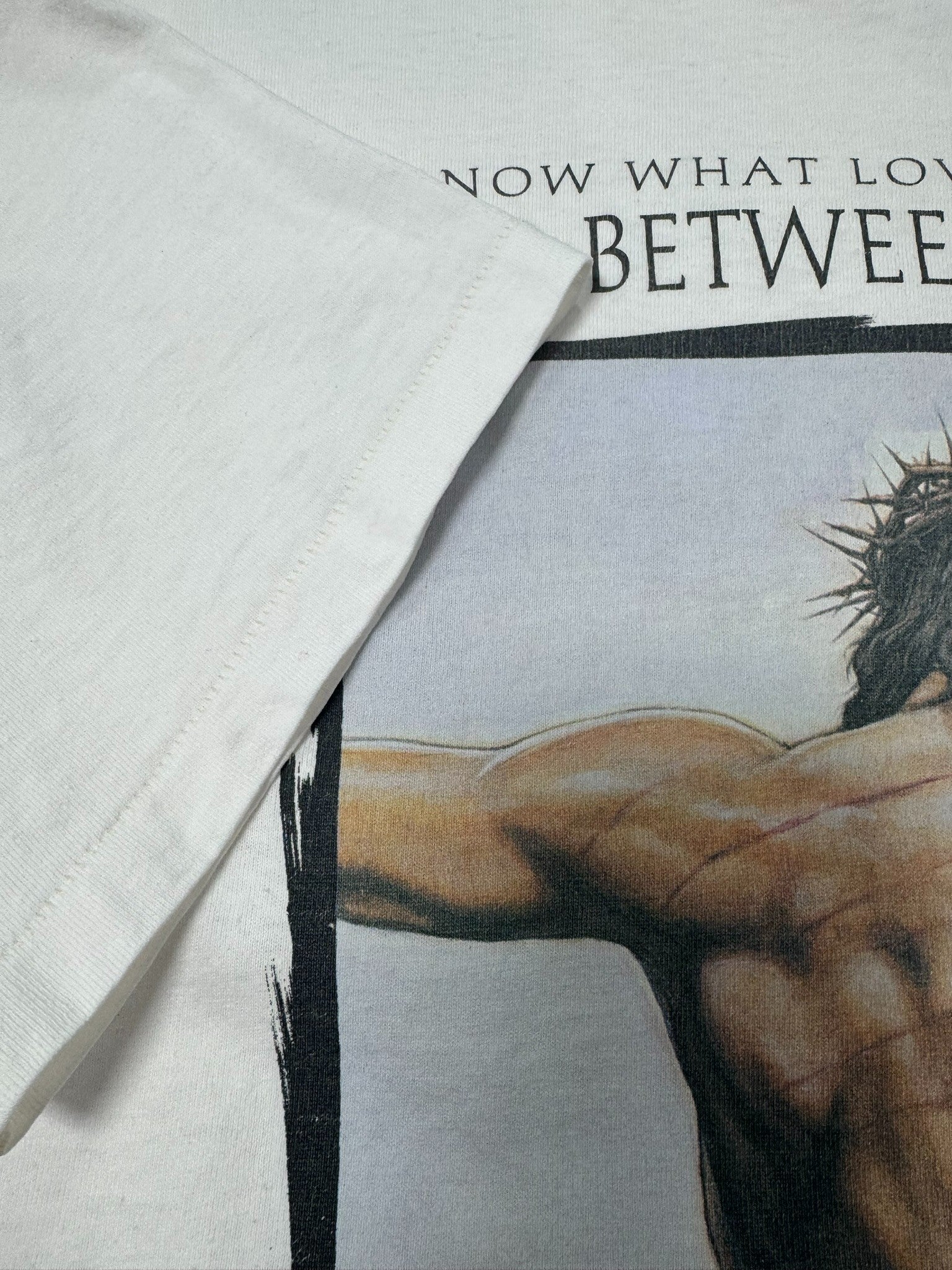 Vintage Christian graphic tee featuring a powerful crucifixion artwork with the phrase “To Know What Love Really Means / Read Between The Lines” printed above the image.