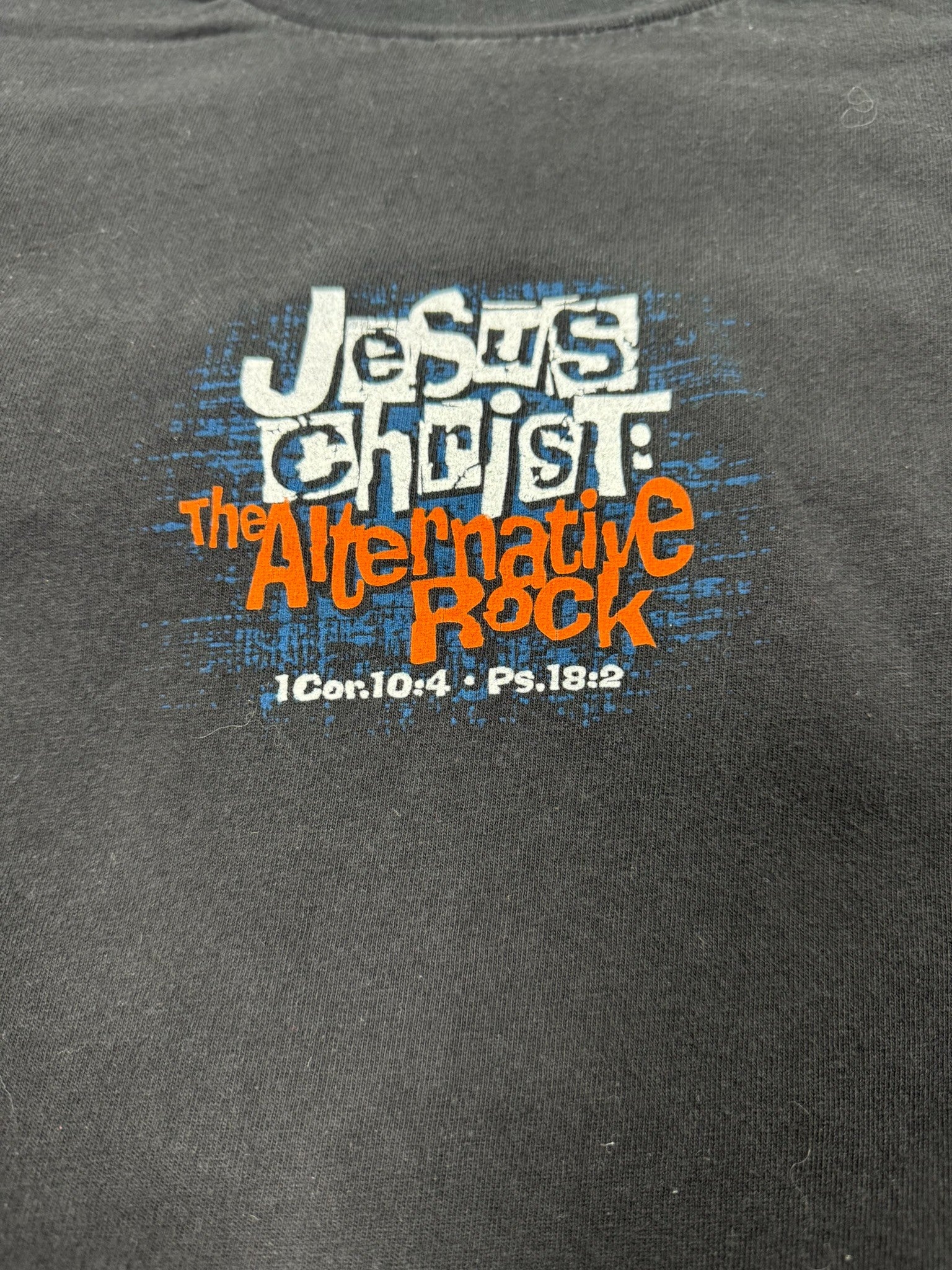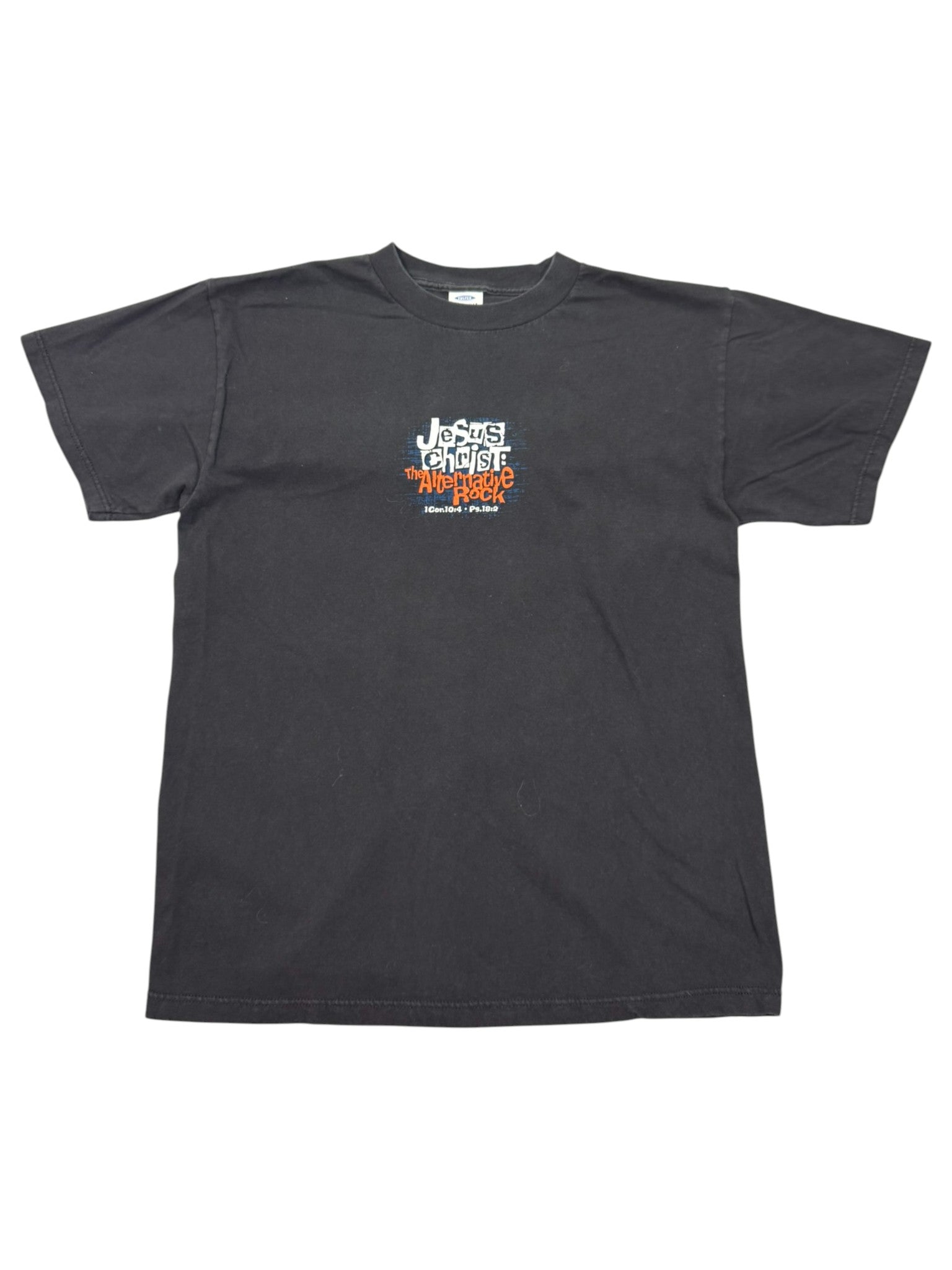 - Vintage Christian graphic tee featuring “Jesus Christ The Alternative Rock” chest print with scripture references (1 Cor 10:4, Ps 18:2).