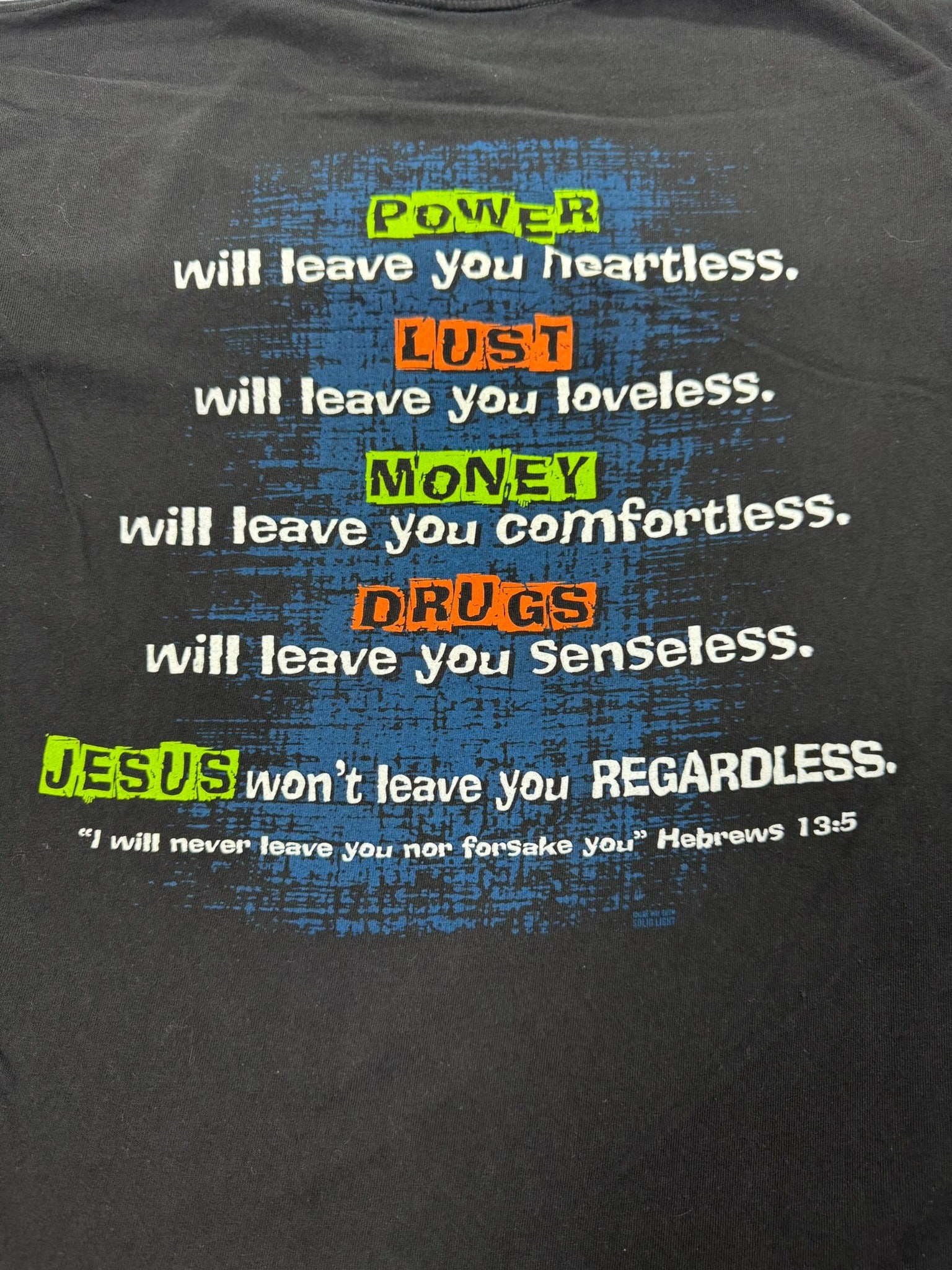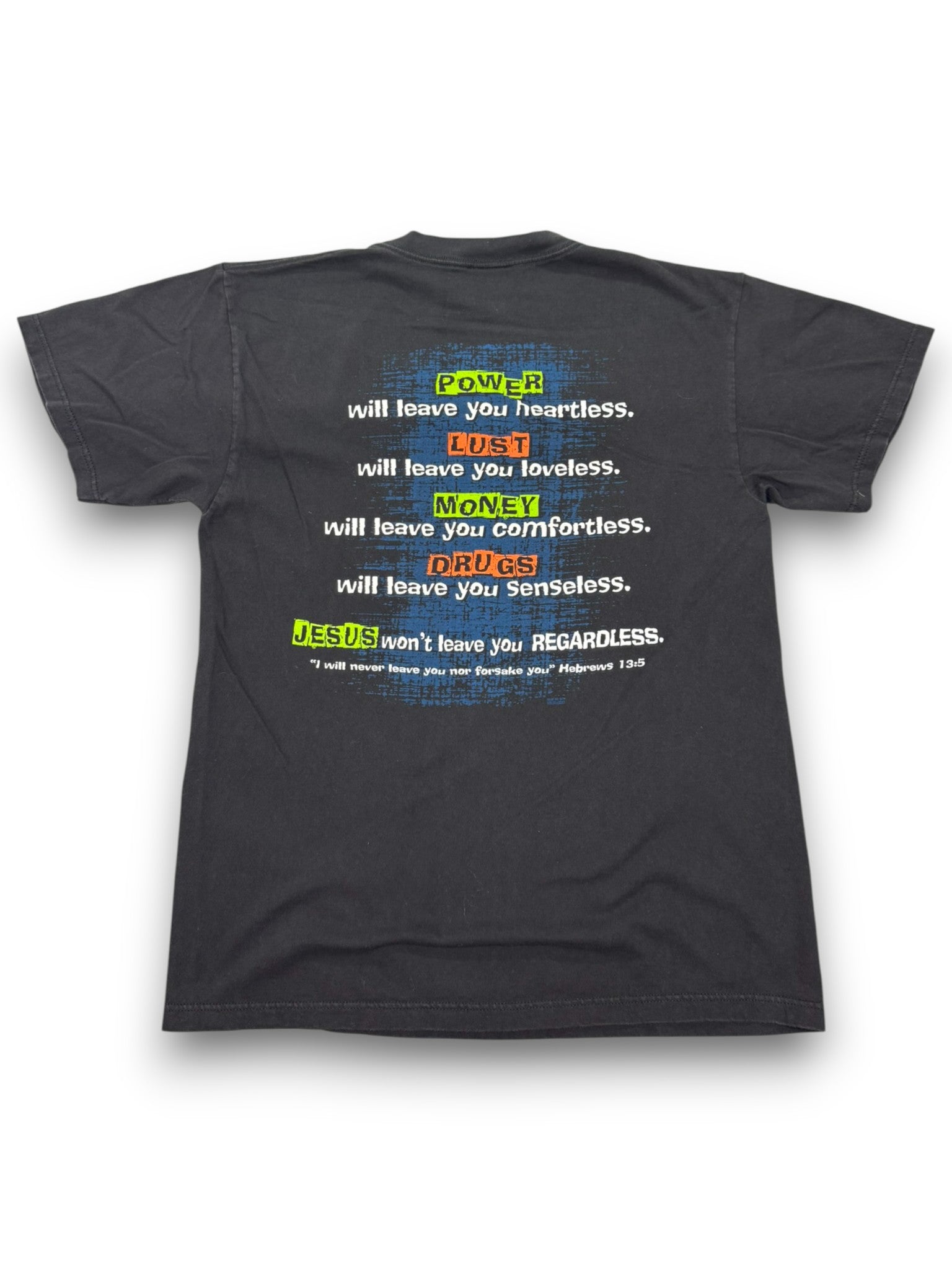- Bold full back graphic with powerful message contrasting power, lust, money, and drugs against faith, ending with Hebrews 13:5.