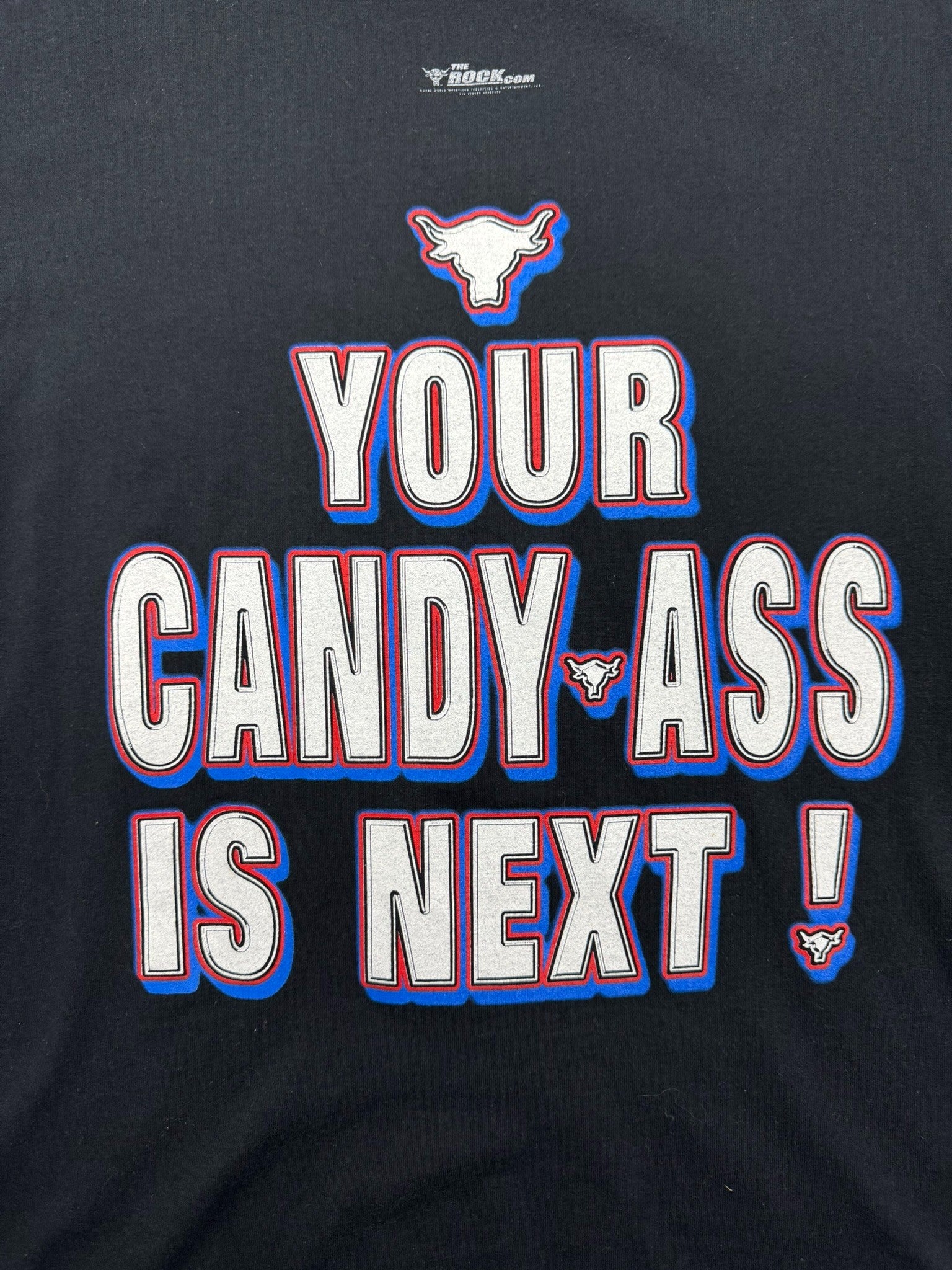Back graphic reads “YOUR CANDY ASS IS NEXT!” with The Rock bull logo hit