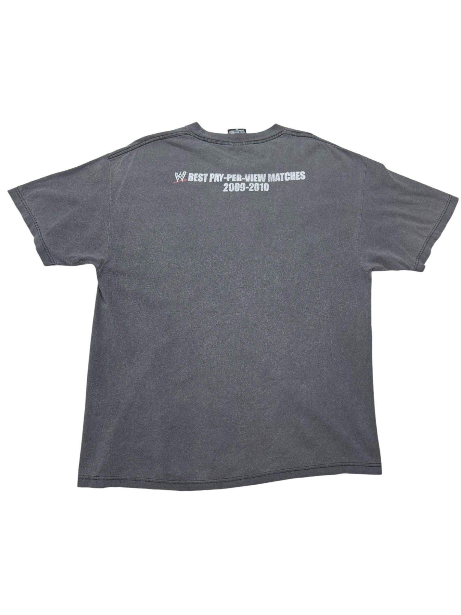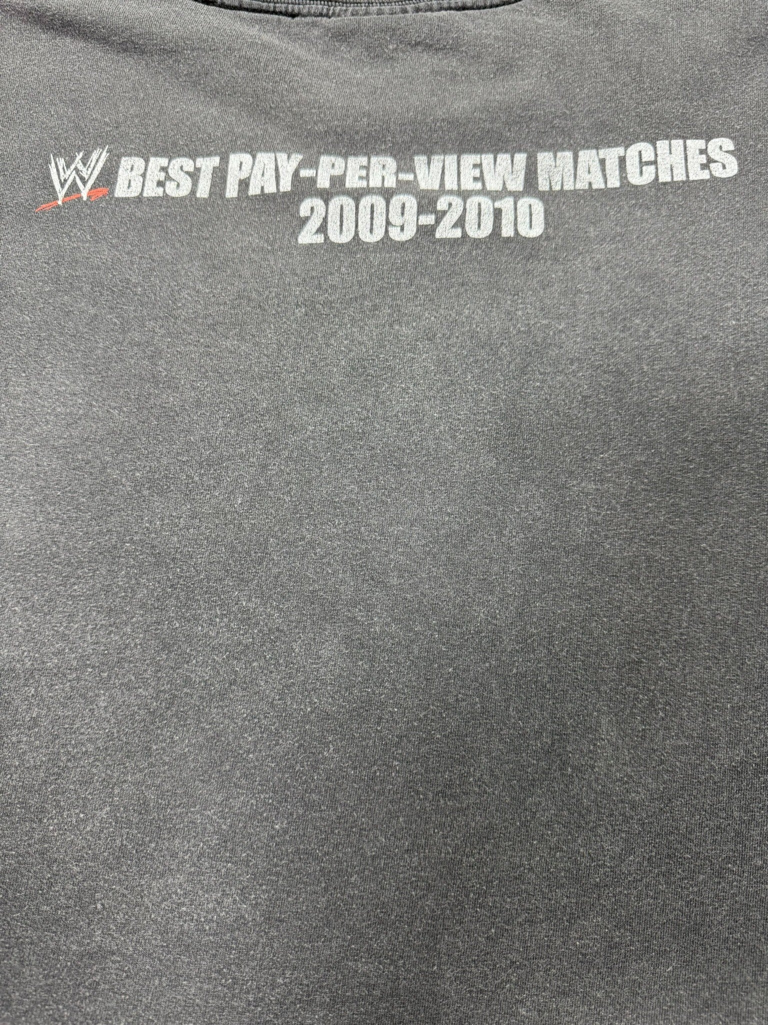 Vintage WWE Best Pay-Per-View Matches graphic t-shirt from the late 2000s. Features a front graphic with multiple iconic WWE superstars and a back hit reading “Best Pay-Per-View Matches 2009–2010.” Officially licensed WWE Authentic merchandise with a soft, broken-in feel and natural vintage fade throughout.